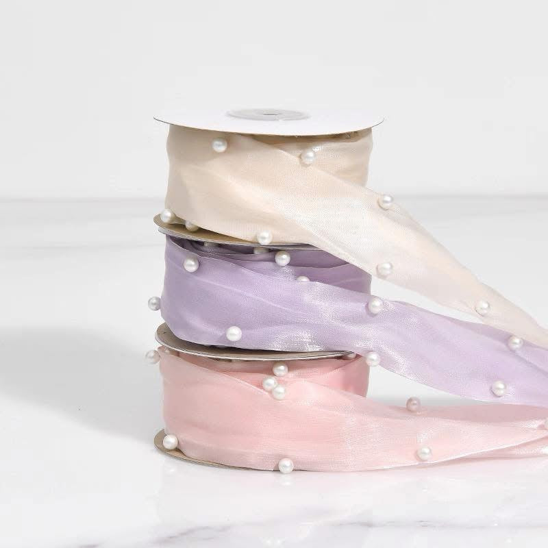 Shimmery pearl ribbon with embedded pearls, each set with a metallic stud backing. Elegant and perfect for luxe décor, crafts, or special accents. Width: 4 cm