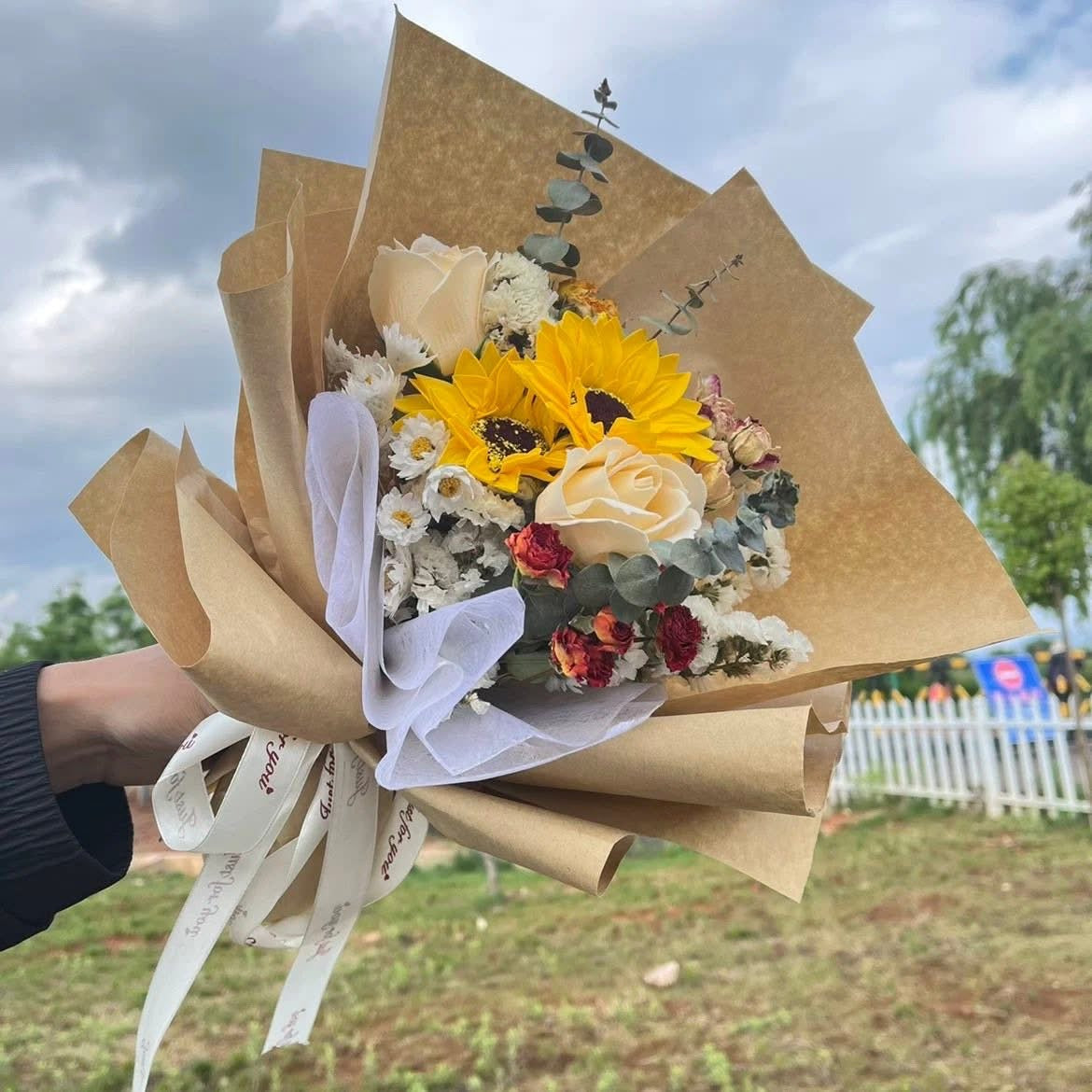 Sunflowers and roses paired with delicate dried flowers, radiating warmth and charm.