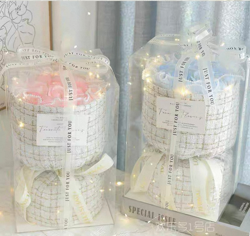 Premium fabric-wrapped rose bouquet in a transparent box, featuring string lights and a card for a perfect gift